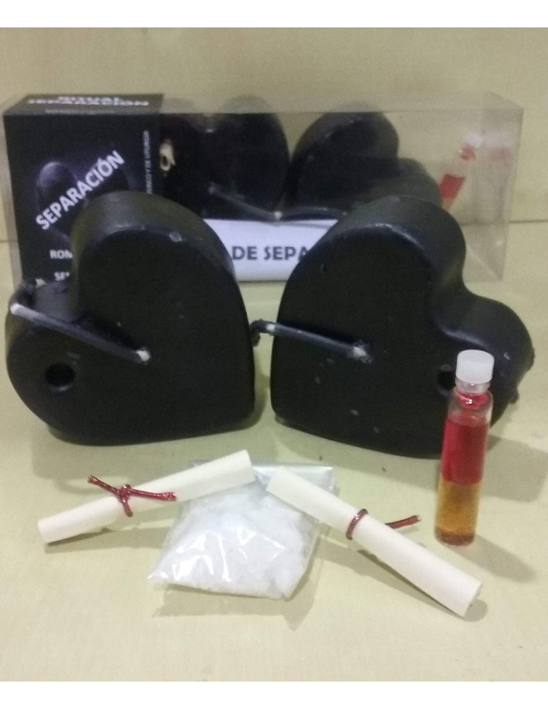 Ritual conjunto separación preparado para alejar o separar a la pareja. Viene presentado en blister con todos los elementos para hacer el hechizo y con instrucciones de uso.